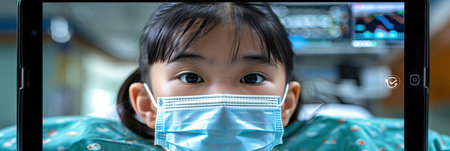 A young girl, with a medical mask, is gazing at the camera through a tablet screen, displaying expressions like happiness and innocence