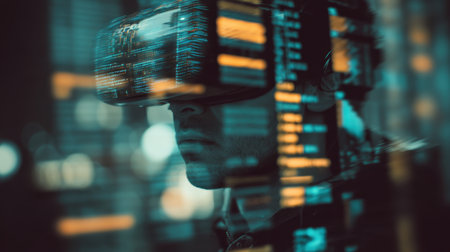 Immersive virtual reality experience with person wearing VR headset, surrounded by digital data and glowing interfaces. scene conveys sense of futuristic technology and innovation