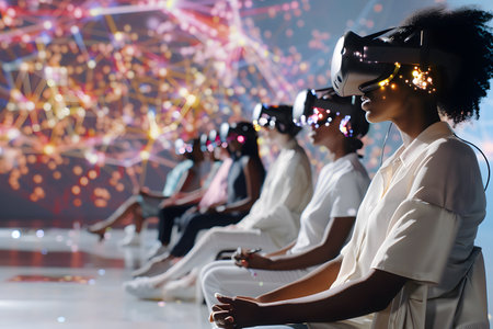 Explore a vibrant scene of virtual reality, where individuals engage with immersive music and dynamic visuals, creating a unique sensory experience.