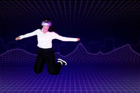 Happy businesswoman wearing a VR goggles while jumping in the metaverse