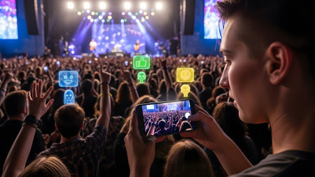 Person films concert with smartphone displaying social media icons above crowd. Clear details and...