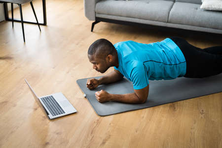 Young African American black male athlete watching workout videos on his laptop doing an online class while holding plank position. Keeping fit, exercising at home.