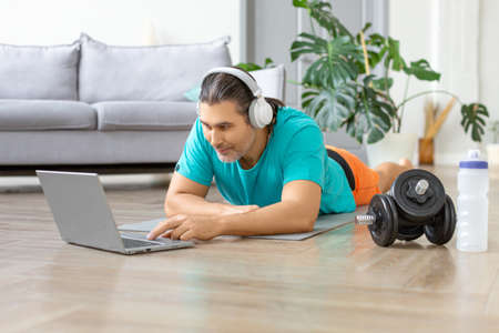 Man doing sports at home lying on a mat watching videos on a laptop and listening to music with a phone and headphones.
