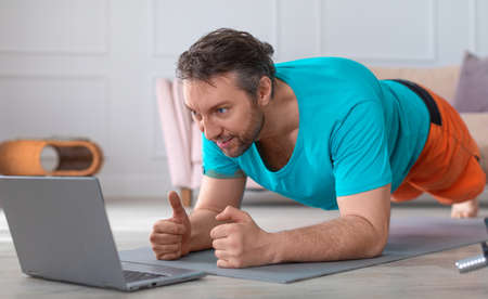 Staying fit. Mature man fitness instructor in sportswear doing push ups on yoga mat at home while conducting online training, having virtual fitness class