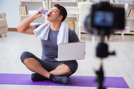 Handsome man watching a home workout video on his laptop and getting ready to exercise