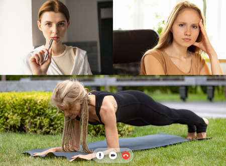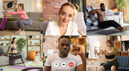 Collage made of young multiethnic men and women watching online sport trainings, using video app. PC, laptop screen with fitness coach