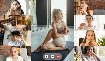 Young multiethnic people, men and women watching yoga trainings, sport tv programme using video app. PC, laptop screen. Collage