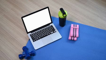 Water bottles, dumbbells and laptop on wooden floor. Workout training at home.