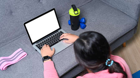 Close up of young female watch online fitness training at home using internet laptop application, back view of millennial girl enjoy sports workout video on computer with wireless internet connection