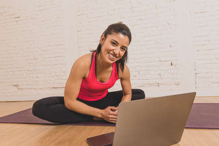 Young beautiful latin woman working out at home connected to online fitness class on the computer laptop. Woman personal trainer coach on zoom teaching exercises in live streaming workout class.