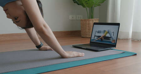 Beautiful Chinese woman exercising yoga while watching instructional videos on laptop at home