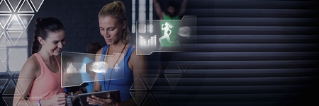 Standing male wearing black sleeveless shirt in gym, with world map, chart overlays on grid windows. Fitness, data visualization, modern infrastructure, technology, productivity, innovation, health