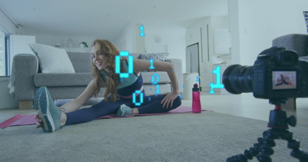 Image of looping binary codes, caucasian woman recordings stretching exercise on image recorder. Digital composite, multiple exposure, home, coding, fitness, social media and active lifestyle.