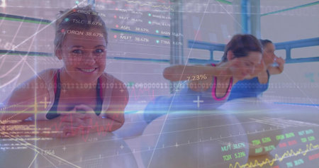Data processing against caucasian fit woman performing push up exercise at the gym. sports, fitness and technology concept