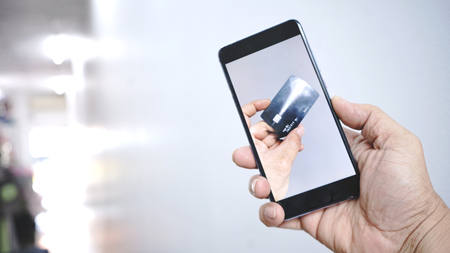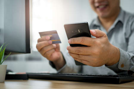 A Man holding credit card and using smartphone for payment online for purchase after order products via the internet. The concept of technology for e-commerce (electronic commerce)