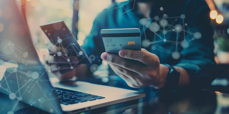 credit card and mobile phone on a laptop for e-commerce. digital online shopping payment. internet banking.