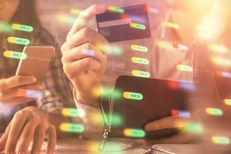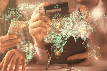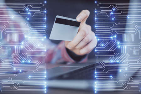 Double exposure of man hands holding a credit card and tech theme drawing. Technology in E-commerce concept.