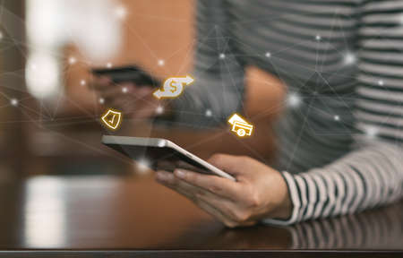 Businesspeople using a smartphone, transfer money, pay for goods and services with a secure protection system. Mobile banking network.