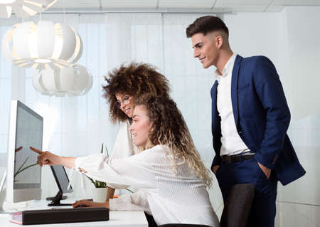 some young coworkers working in the office. There are two women and a man.They look like happy. They are wearing smart and casual clothes. They are working in their computers.