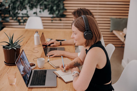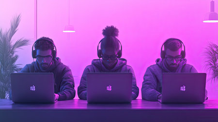 Three diverse individuals are engaged in focused work on laptops, wearing headphones in a vibrant workspace. The modern environment enhances collaboration and creativity.