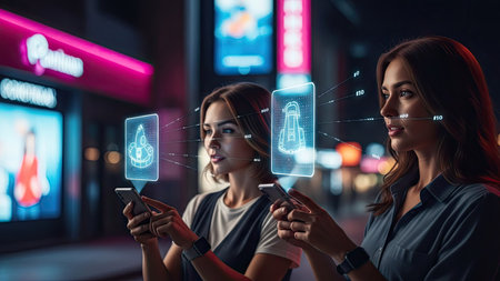 Two women stand holding smartphones displaying projected interfaces. The scene is illuminated by neon lights, creating a modern, urban atmosphere. The image showcases advanced technology with visual elements and is suited for commercial uses in the fields of innovation and communication.