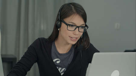 Telemarketing headset woman from call center woman in headphones speaking with client during her work at office