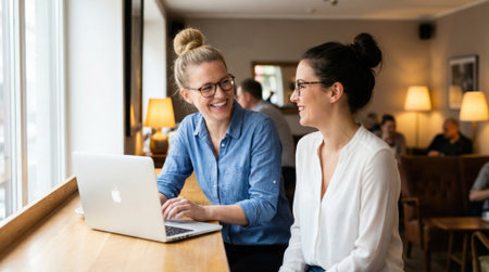 Two cheerful young businesswomen with glasses working together on a laptop in a cozy coffee shop. They are smiling and engaged in a positive discussion by a bright window.