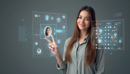 A smiling young woman with long brown hair stands against a sleek gray background, playfully making a peace sign while engaging with a futuristic digital interface. The holographic display showcases various icons and images, symbolizing connectivity and technology, creating an atmosphere of innovation and modernity.