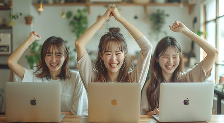 Three young women joyfully raising their arms while using laptops in a bright cafe setting.