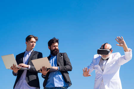 Friendy mixed race team of business workers work with modern technologies wear fashionable clothes use high speed connection isolated over grey concrete wall Internationa : Generative AI