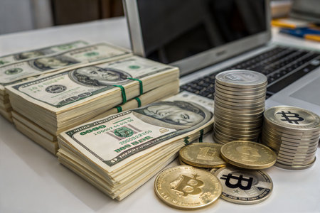 Stacks of US dollar bills and Bitcoin cryptocurrency coins sit on a laptop keyboard. Represents finance and technology.