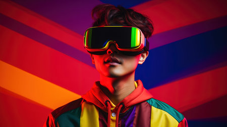 Portrait of a young man wearing virtual reality goggles against colourful background