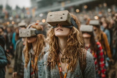 People experiencing immersive virtual reality in digital world