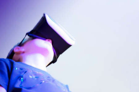 Defocused boy in virtual reality glasses. Blurred and unfocused background of new virtual reality technologies