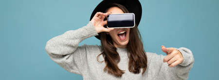 panoramic Closeup of attractive young happy woman wearing black hat and grey sweater holding phone pointing finger finger at camera isolated on background