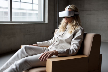 Relaxing woman on sofa experiencing virtual reality through glasses with copy space for text