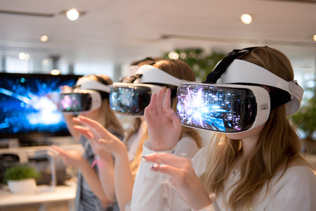 Diverse group wearing VR headsets engaged in virtual collaboration in a neon-lit environment. Great for metaverse, tech, and remote work themes.