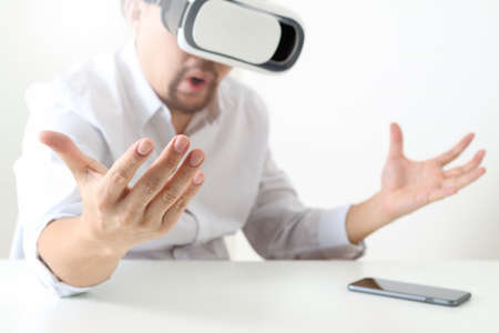 businessman wearing virtual reality goggles in modern office with mobile phone using with VR headset