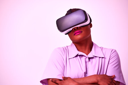 African American man experiencing virtual reality technology while wearing VR glasses on pink background