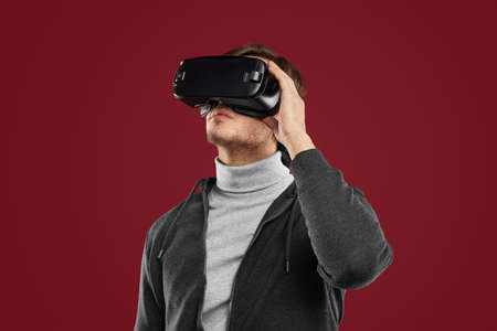 Young bearded man sitting against computer with virtual reality glasses trying to touch something or tap some thing in front of what he seeing. Modern technologies. The concept of future technology.