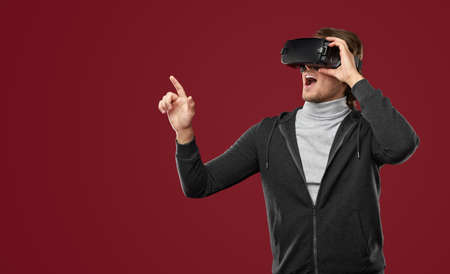 Young man wearing virtual reality glasses and touching on virtual screen. Virtual reality concept