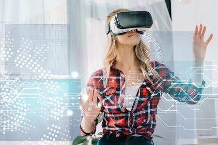 young woman in virtual reality headset pointing at cyber security signs in room