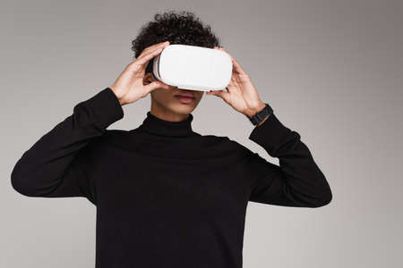 young african american man in vr headset isolated on gray