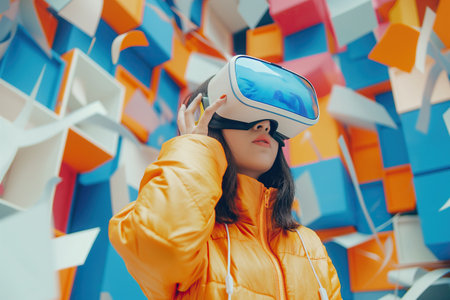 A woman engages with virtual reality equipment, immersed in an interactive experience. The colorful backdrop features playful graphics, enhancing the engaging atmosphere.