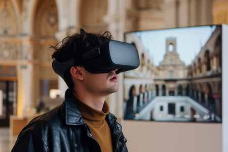 VR in a museum. A man wearing VR glasses and headphones is in a museum.