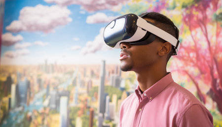 An AI generated illustration of a male wearing a VR headset immersed in an AI experience