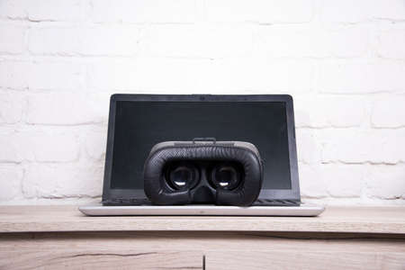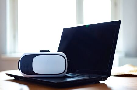 virtual augmented reality glasses lie on a laptop against a bright window
