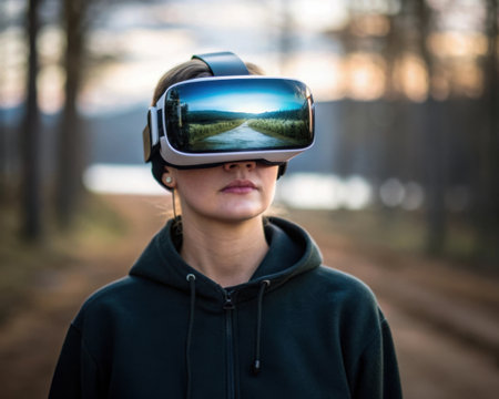 Person wearing virtual reality headset outdoors experiencing nature scene