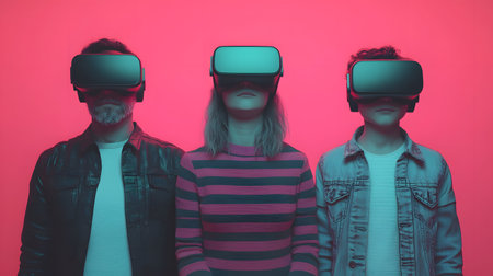 Three individuals, wearing VR headsets, stand still against a bright pink background, evoking adventure and excitement.