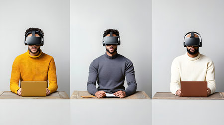 Three men wearing VR headsets are engaged in a virtual meeting while seated at wooden tables, expressionless. The background is minimalistic and solid, focusing on immersive tech.